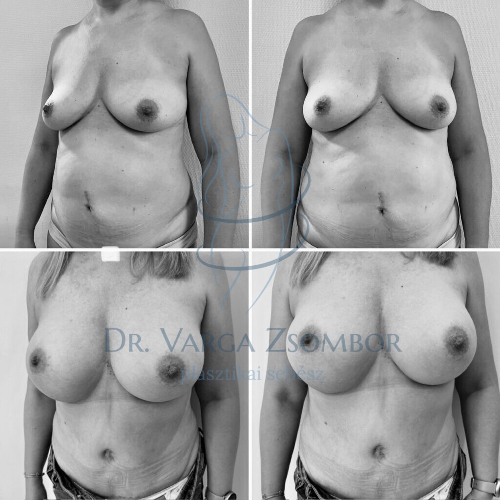 A kétgyermekes édesanya eredetileg csak a hasát szerette volna helyrehozni a jelentős rectus diastasis miatt, ám a külföldön végrehajtott laparoszkópos technika sajnos nem váltotta be a hozzá fűzött reményeket. Szerencsére ezután ránk talált, és dupla adag bizalmat megszavazva nekünk a ciciket is ránk bízta. Az alhasról végül 1120 gramm bőrfelesleget és 900 ml zsírt távolíttunk el, a kebleket pedig 425 köbcentis implantátumokkal formáztuk meg.