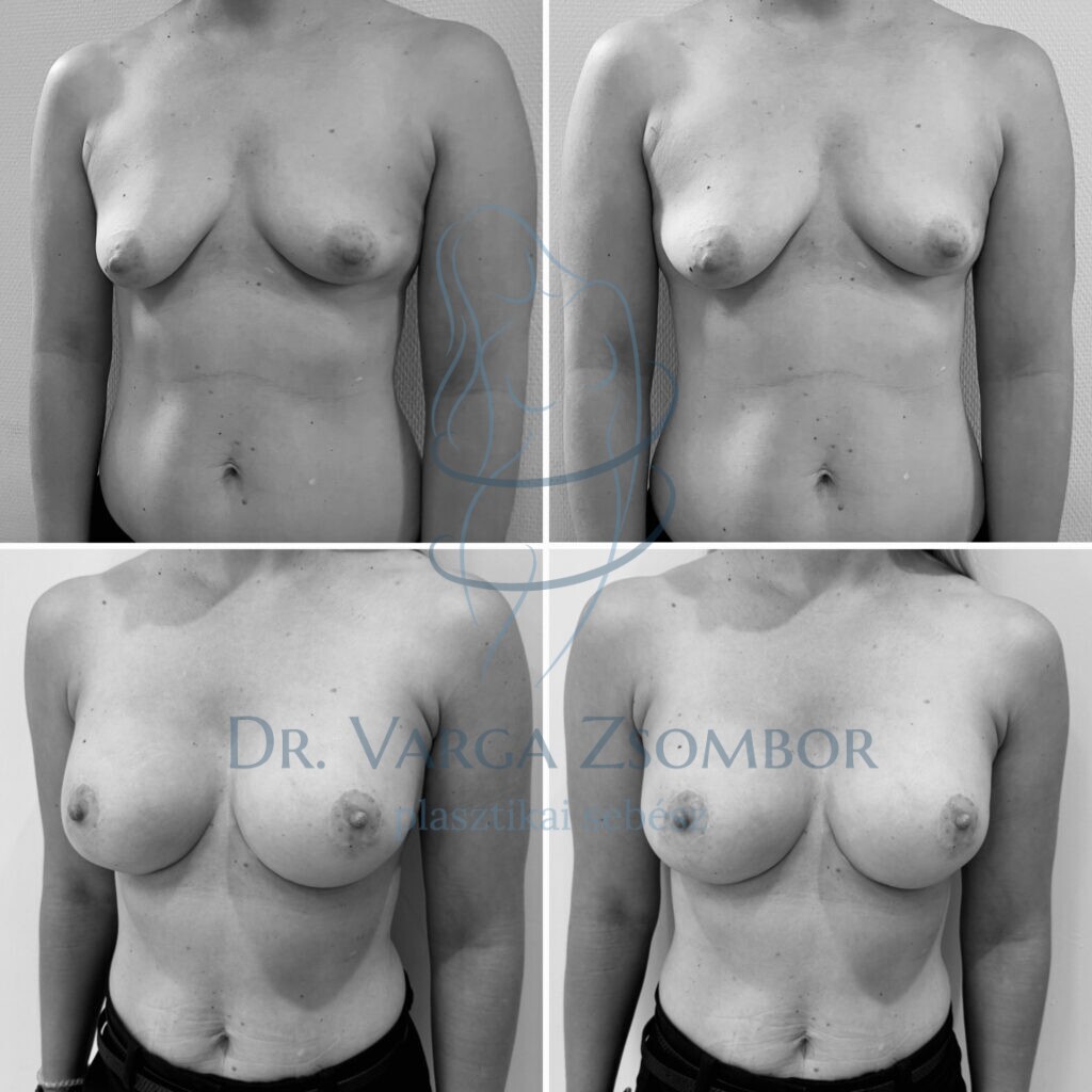 35 éves Páciensünk 2 gyermek büszke édesanyja, és a műtét után már 2 csodaszép cici tulajdonosa is. Fiatal korától tubularis emlődeformitás állt fenn, a bimbóudvarok is eltérő méretűek voltak (45, illetve 55 mm). A beavatkozás alkalmával Motiva RSD-360 (középmagas) progressive gel+ implantátumokat használtunk, a mirigyállományt felvarrással formáztuk, a bimbóudvarokat egységesen 35 milliméteresre alakítottuk.