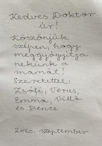 “Mivel nem hiszek a véletlenekben, de a megérzéseimben annál inkább tudtam, hogy a lehető legjobb helyen vagyok. Ezért minden bizalmat megszavaztam Önnek, mert éreztem, hogy Én is fontos vagyok nem csak a betegség legyőzése mindenáron. Ami olyan erőt adott, hogy nem voltak kétségeim a gyógyulásomat illetően. A jelenlegi eredmények alapján életem egyik legjobb döntése volt. Meglehet, hogy így leírva nem olyan varázslatos vagy csak egy kis csillámpor hiányzik, de Nekem egy CSODA volt.”