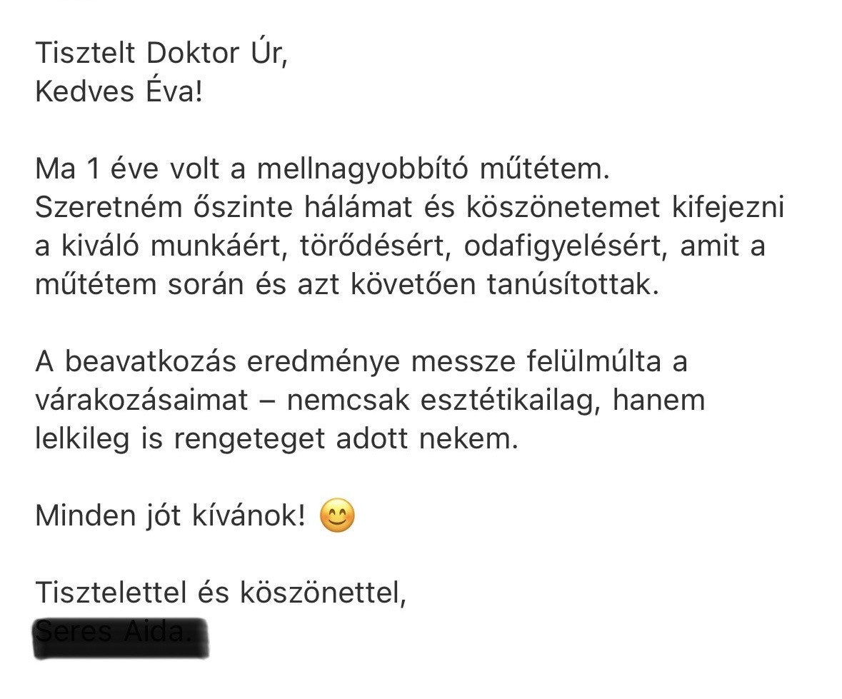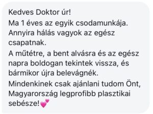 ”Bàr tudom hogy mèg messze a teljes gyógyulàs, de szeretnèm ha tudnà, hogy nagyon-nagyon hàlàs vagyok önnek, mert felülmúlta a vàrakozàsaimat. Gyönyörű lett, szinte màr tökéletes! Nagyon jól èrzem magam, ès külön köszönöm, hogy nem kellett felvarrni.”
