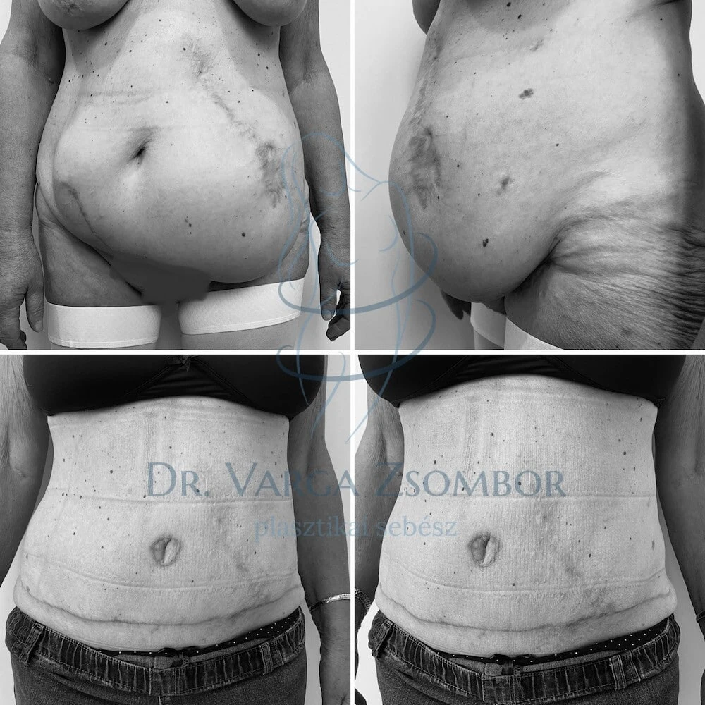 A műtét során egy speciális technika segítségével, saját anyag felhasználásával több rétegben rekonstruáltuk a hasfalat, műanyag hálót nem használtunk. A bőrfelesleget eltávolítottuk, a köldököt megkíméltük és új helyen rögzítettük. A páciens másnap draincső nélkül elhagyhatta a klinikát.