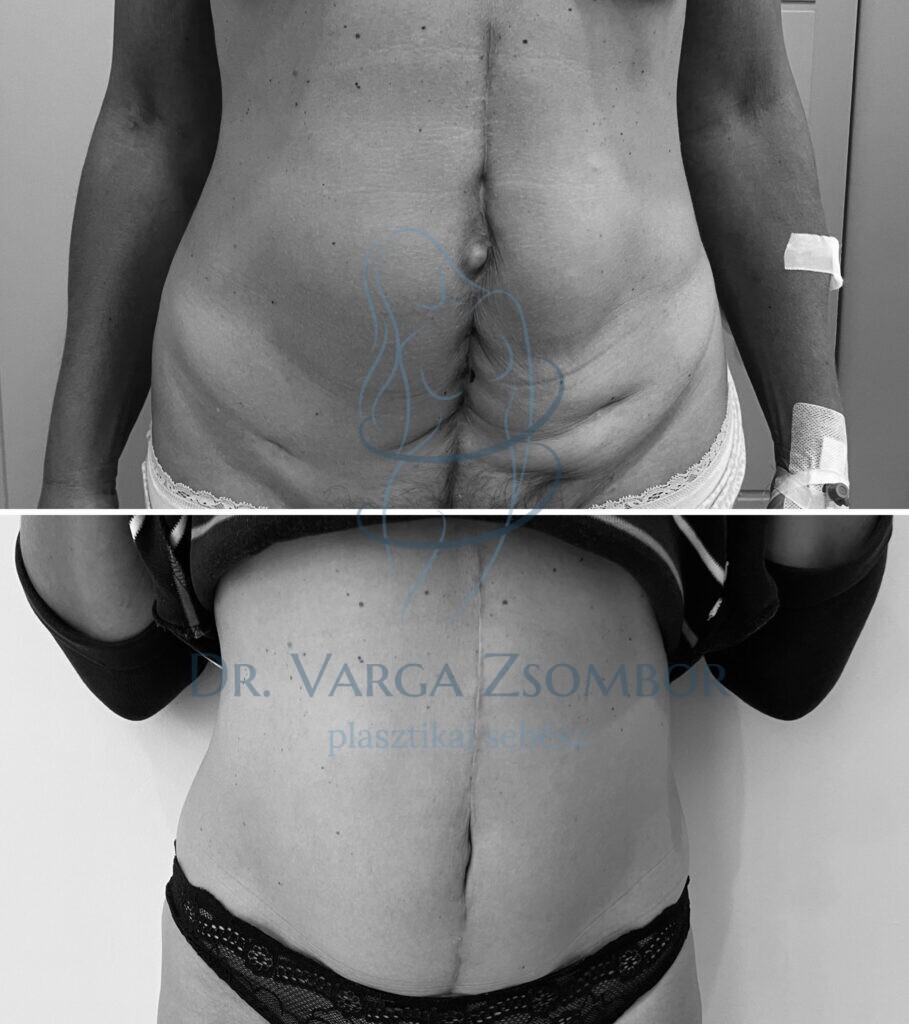 60 éves édesanya nőgyógyászati daganat eltávolítást követő hasfali heggel, szétcsúszott hasizmokkal érkezett. A műtét során rekonstruáltuk a hasfalat és eltávolítottuk a letapadt, heges bőrfelesleget is. 3 hónapos kontrollon ezt a változást láthatjuk. A hegek a következő hónapokban várhatóan tovább halványulnak majd.