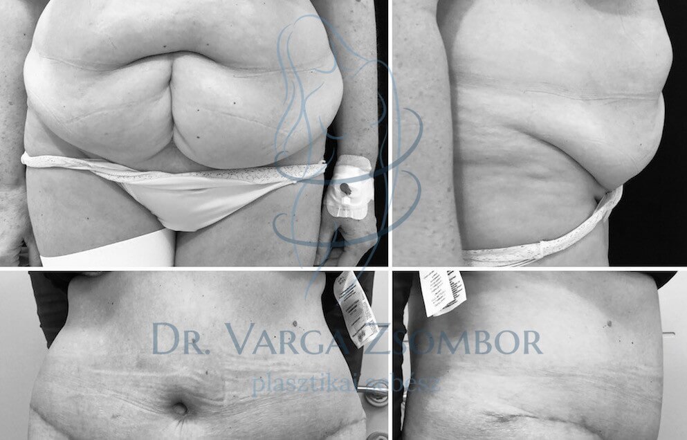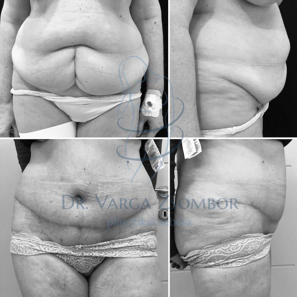 A lenti hölgy esetében eltávolítottuk az alhas területén lévő bőr-, és zsírfelesleget, megerősítettük a szétcsúszott hasizmokat, illetve új köldököt alakítottunk ki. A has maradék bőrét egy jóval nagyobb területre feszítettük ki, ezáltal vékonyítva az alatta elhelyezkedő zsírréteget. A heget igyekeztünk minél mélyebbre helyezni, ezáltal a páciens régi álma, a kétrészes fürdőruha is újra viselhető ruhadarab lett 🙂 A kép a 3 hónapos kontrollon készült, a hegek még nagyon sokat fognak halványodni a szövetek remodellációja során.
