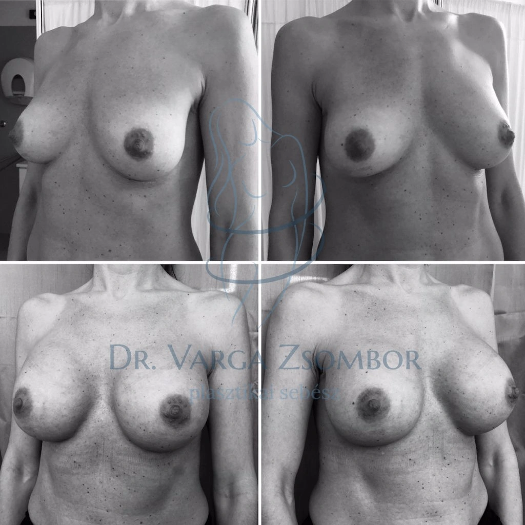 Mi most egy példát szeretnék mutatni Önöknek. 2 gyermek szoptatása után a mellek felső pólusa picit sorvadt, a szalagok kissé megnyúltak. Szerencsés esetben a már meglévő implantátum ellensúlyozza a mell felső részének méretcsökkenését. Így jelen esetben is a mellek formája szép maradt, viszont a hölgy szeretett volna nagyobb ciciket. Implantátumcsere esetében jellemzően nagyobbra cseréljük azokat, a felvarrást (és az ezzel járó több heget) elkerülendő. Emiatt ha kezdetben túl nagy implantátumot teszünk be, kénytelenek leszünk a csere során is jóval nagyobb méretet választani. A képen 280 köbcentis méret lett 560-asra, azaz pontosan a duplájára kicserélve – a páciens kifejezett kérése alapján.