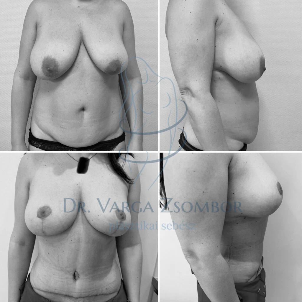 Az emlők jelentősen megereszkedtek a 3 év szoptatást követően, illetve a mirigyállományban az aszimmetria is feltűnő volt. A bimbókat végül csaknem 8 centiméterrel emeltük feljebb az eredeti állapothoz képest, illetve a bimbóudvar átmérőjét is csökentettük kevesebb, mint a felére. A bal oldalról 170 gramm, a jobb oldalról pedig 300 szövetet távolítottunk el, hogy egyforma méretűek legyenek a mellek, majd a felvarrásnak megfelelő technikával formáztuk újra. Ezenkívül teljes hasplasztikát is végeztünk zsírleszívással kombinálva a derék és a has területéről.