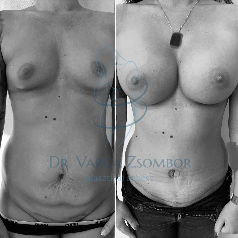 Elvégzett beavatkozások: emlőkorrekció dual plane technikával (450cc kerek implantátummal), teljes hasplasztika hasfali rekonstrukcióval, alhasi bőrfelesleg eltávolítással, köldök áthelyezéssel.