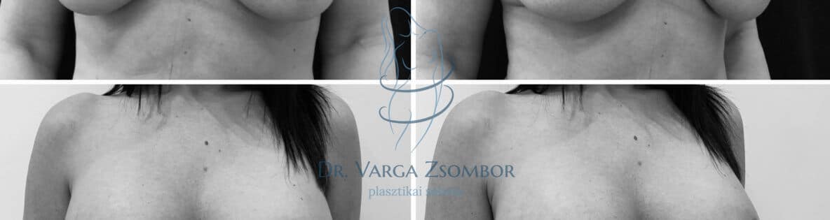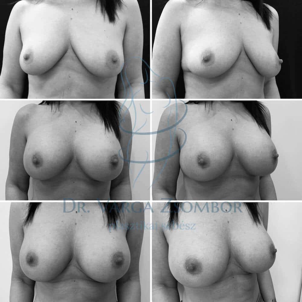 A megereszkedett mellek bizonyos eseteiben megkísérelhető mellfelvarrás helyett a csak implantátummal való korrekció. Jellemzően akkor van esélyünk a sikerre, ha a mellbimbó legalább 1 centiméterrel az emlő áthajlási vonala felett helyezkedik el (inframammary fold = IMF). Amennyiben a redő szintjét meghaladja, sajnos nem érdemes megpróbálni ezt a megoldást, mert nem kerülhető el a felvarrás – hacsak nem nagy kompromisszumok árán. A műtét során a dual plane technikát alkalmazzuk, ami azt jelenti, hogy első lépésben elválasztjuk a mirigyet a mellizomtól, ezáltal kialakítunk egy mirigy mögötti üreget. A második lépésben felemeljük a mellizmot, kialakítjuk az izom mögötti üreget is. Az implantátumnak a fele (jó esetben kétharmada) izomborítást fog kapni, az alsó részét viszont csak a mirigyállomány fedi majd. A rétegek elcsúszásából és az IMF redő megnyúlásától várjuk majd a végleges eredményt, a mellek labdaszerű formáját. Ez a folyamat akár 2-3 hónapot is igénybe vehet. A képen a műtét előtti, a 3 hetes, illetve a 3 hónapos kontrollon készült fotó látható.