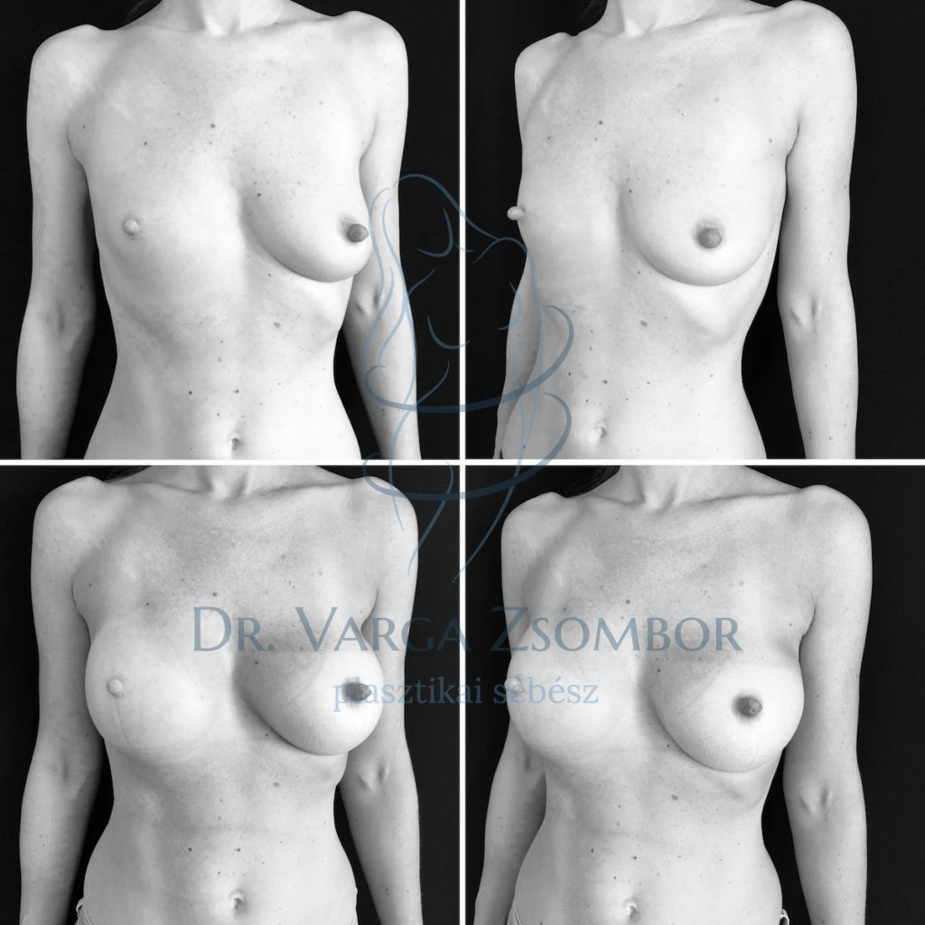 Tökéletesen egyforma mellek nincsenek. A mell aszimmetriának különböző fokozatai vannak. A teljes mellizom-, és emlőhiánytól (Poland-szindróma) az alig észrevehető aszimmetriáig (szinte minden nőnél). Sok esetben egy egyszerű melltartó vásárlás is lehetetlen feladatnak tűnik. Az eltérést van, hogy csak implantátumok segítségével tudjuk orvosolni, más esetekben a saját szövetek újraformázása is elegendő oly módon, hogy az egyik oldalt felvarrjuk, a másikat pedig kisebbítjük. A lenti képen egy csinos anyuka szánta el magát a korrekcióra, az eredmény magáért beszél. Jelen esetben különböző méretű, illetve formájú implantátumokat használtunk.