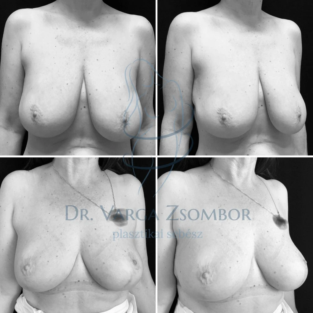 A nagy keblek fiatal korban nagyon népszerűvé teszik viselőjüket, főleg a férfiak körében. A gravitáció viszont az évek alatt szorgalmasan teszi a maga dolgát, melynek eredményeképpen a szalagrendszer és a mell bőre szép lassan megnyúlik. Szerencsére számos plasztikai sebészeti technika létezik, amivel újra visszaadhatjuk a csinos dekoltázst. A képen szereplő hölgy bimbóudvara 6-7 centimétert költözött feljebb a mellfelvarrás után, a mirigyállományt a mellizmon magasabbra rögzítettük, a felesleges bőrt kimetszettük. A hegek egy fordított T alakot vesznek fel, illetve a bimbó körül húzódnak végig. Ez utóbbi szépen bele tud simulni a pigmentáltabb udvarba, de egy hegtetoválással szinte láthatatlanná is tehetjük. Idővel a függőleges heg is nagyon szépen elhalványul, az áthajlásban lévő vízszintes heget pedig a cicik természetes esése fogja elfedni. A beavatkozás után továbbra is fontos a melltartó viselése, főleg sportolás során.