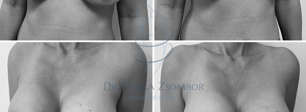 45 éves édesanya (164cm, 53kg, mellkas körfogat 73cm) mellfelvarrása, amelyet 325cc középmagas kerek Mentor implantátumok beültétésével egészítettünk ki a felső pólus “kikerekítésének” érdekében.