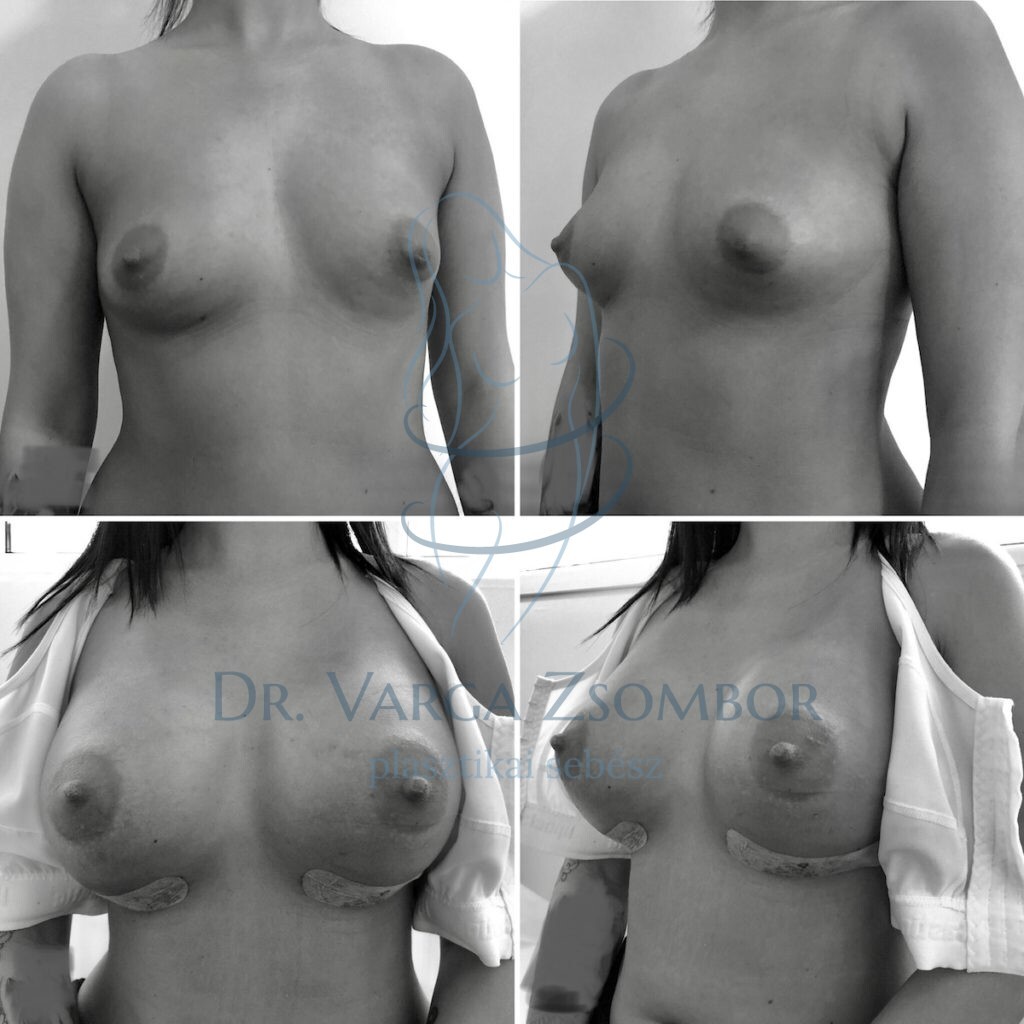 Az alábbi kép egy jó példa arra, hogy mellnagyobbítás során kerek implantátummal is szép, természetes hatást lehet elérni. A képeken egy fiatal anyuka szerepel, a műtét előtt és a beavatkozást követő 2 hetes varratszedéskor. A műtét során igyekeztünk a rövid alsó pólust teltebbé varázsolni, a klasszikus 45-55%-os arányt elérni. Ez azt jelenti, hogy a mellbimbó a keblek alsó-, és felső pólusa között húzott képzeletbeli vonalat ilyen arányban osztja el – a lenti rész javára. Ahogy azt már többször is megjegyeztük, nem csak egyetlen implantátum lehet a tökéletes választás! Például ennél a hölgynél többféle implantátum is gyönyörű eredményt hozott volna. Akár 250-450 köbcenti közötti méretek között keresgélve (mi végül a középső sávot választottuk), akár magas vagy extra magas profilú formákat próbálgatva (egyéni ízlés kérdése), akár a különböző gyártók között válogatva. Egy konzultáció emiatt sem tarthat például csak 20 percig! Elegendő időnk kell legyen arra, hogy megismerjük egymást, a páciens kimondott-ki nem mondott vágyait is meg kell valósítanunk. Elegendő időt kell hagyni a különböző melltartók és felsők próbálgatására, illetve a kísérőként érkezett hozzátartozó jelenléte sem lehet akadály.