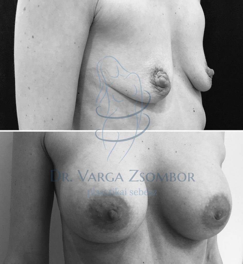 A képen szereplő édesanya a cicijeit nem kímélve táplálta önzetlenül gyermekeit, viszont néhány évvel később, a szoptatás befejezése után a mellek maradandó változást szenvedtek. A legtöbb esetben a terhesség és szoptatás során az egyébként alvó állapotban lévő tejmirigyek megduzzadnak, az anyának gyönyörűszép formás keblei lesznek. A szoptatás befejeztével viszont sorvadási folyamat indul, amely szerencsés esetben enyhe, más esetekben viszont igen kifejezett lehet. A bőr kitágul és meg is ereszkedik az apró melleken, ami hatalmas szomorúságot okoz a hölgyeknek. A célunk ilyenkor, hogy új életet vigyünk a cicikbe, természetesen szilikon implantátumok segítségével. Az eredmény magáért beszél, teljesen új perspektívák nyílnak az öltözködésben, a strandolásban pláne! Nincs olyan hölgy, akinek az önbizalma ne kapna hatalmas löketet egy ilyen bevatkozás után 🙂
