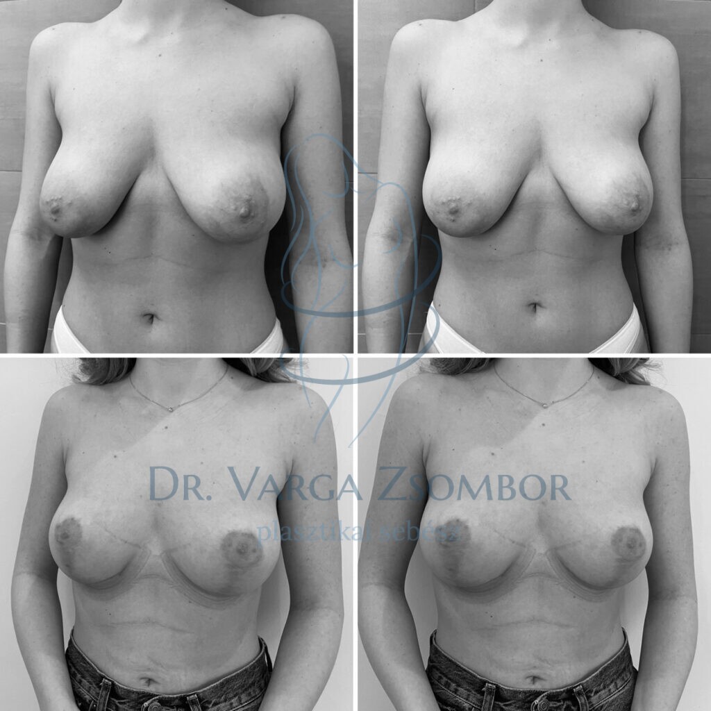 A képen látható 22 éves fiatal hölgy kiindulási fotóján úgynevezett tubuláris melleket látunk, amelyeket nagyon szépen újra lehetett formázni implantátumok nélkül is. A műtőben a klasszikus felvarrást belső varratokkal kombináltuk, valamint bimbóudvar kisebbítés és áthelyezés is történt. Az új, formásabb cicik tökéletesen illenek az illető személyiségéhez 🥰