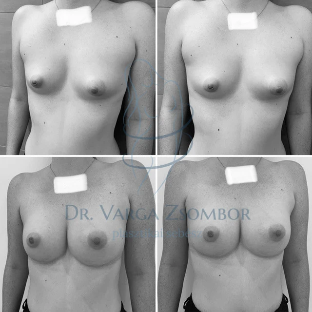 A hölgy 173cm magas, 70kg, a mellkas körfogat 78cm. Tubuláris mellek, mellkasi aszimmetria, tölcsérmellkas, a bordaívek lefutása sem egyforma a két oldalon. A választott implantátumok profilban és méretben is eltérnek (középmagas/magas, illetve 350/400 köbcenti).